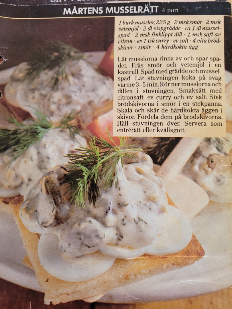 Låt musslorna rinna av och spar spadet. Fräs smör och vetemjöl i en kastrull. Späd med grädde och musselspad. Låt stuvningen koka på svag värme 3-5 min. Rör ner musslorna och dillen i stuvningen. Smaksätt med citronsaft, ev curry och ev salt. Stek brödskivorna i smör i en stekpanna. Skala och skär de hårdkokta äggen i skivor. Fördela dem på brödskivorna. Häll stuvningen över.
