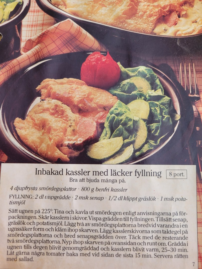 Sätt ugnen på 225 grader. Tina och kavla ut smördegen enligt anvisningarna på förpackningen. Skär kasslern i skivor. Vispa grädden till fyllningen. Tillsätt senap, gräslök och potatismjöl. Lägg två av smördegsplattorna bredvid varandra i en ugnssäker form och kläm ihop skarven. Lägg kasslerskivorna som taktegel på smördegsplattorna och bred senapsgrädden över. Täck med de resterande två smördegsplattorna. Nyp ihop skarven på ovansidan och runt om. Grädda i ugnen tills degen blivit genomgräddad och kasslern blivit varm, 25-30 min. Låt gärna några tomater baka med vid sidan de sista 15 min.