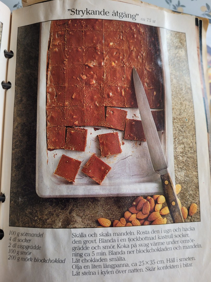 Skålla och skala mandeln. Rosta den i ugn och hacka den grovt. Blanda i en tjockbottnad kastrull socker, grädde och smör. Koka på svag värme under omrörning ca 5 min. Blanda ner blockchokladen och mandeln. Låt chokladen smälta. Olja en liten långpanna, ca 25×35 cm. Häll i smeten. Låt stelna i kylen under natten. Skär konfekten i bitar.